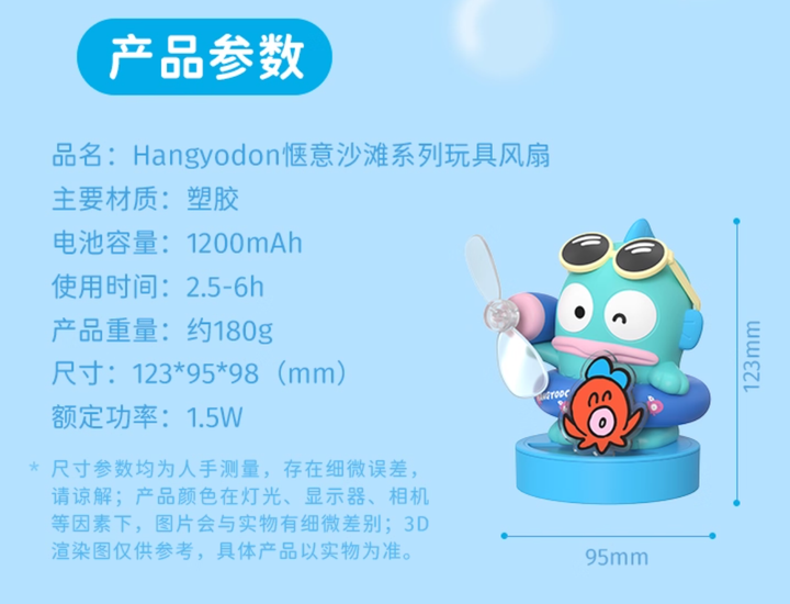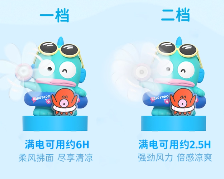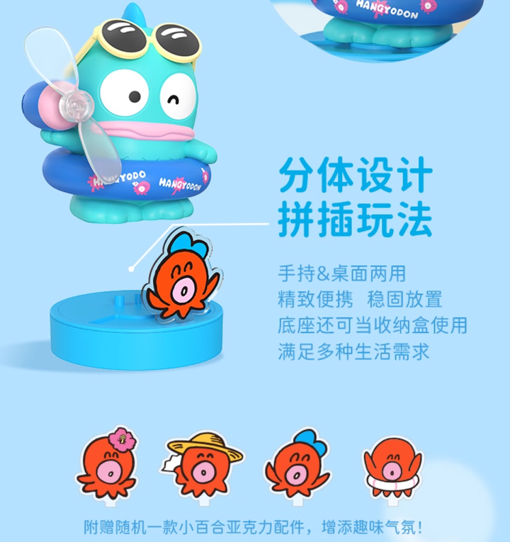 The Sanrio Hangyodon Leisure Beach Series Fan Ornament combines the adorable Hangyodon character with beach elements, creating a functional yet charming fan ornament. The fan offers two-speed wind settings, providing a comfortable cooling breeze. The soft rubber fan blades are safe and gentle, ensuring worry-free use. Each fan includes a random Lily acrylic accessory, adding extra fun and personality. With USB charging, it’s easy to carry around and perfect for desks, workspaces, or home use — a must-have for summer!