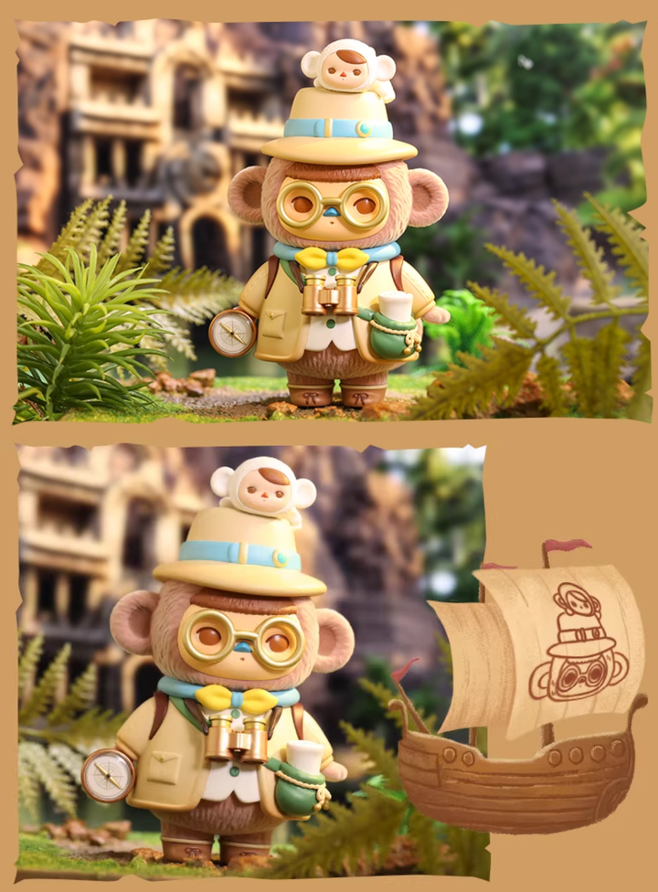 From the whimsical Elf Planet comes the curious Little Monkey Archaeologist, ready to explore uncharted lands and dig up ancient secrets! With a classic explorer’s hat on his head, a compass in hand, and a sturdy wooden box on his back, this figure is the perfect mix of cute and courageous.