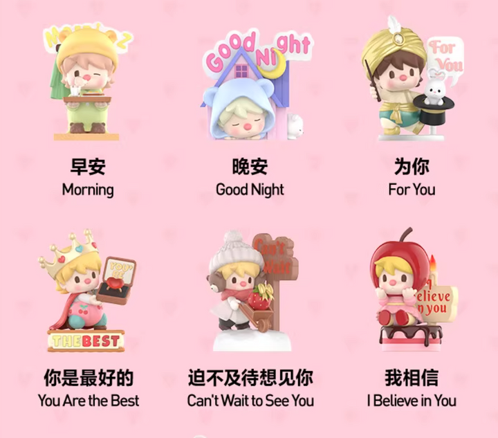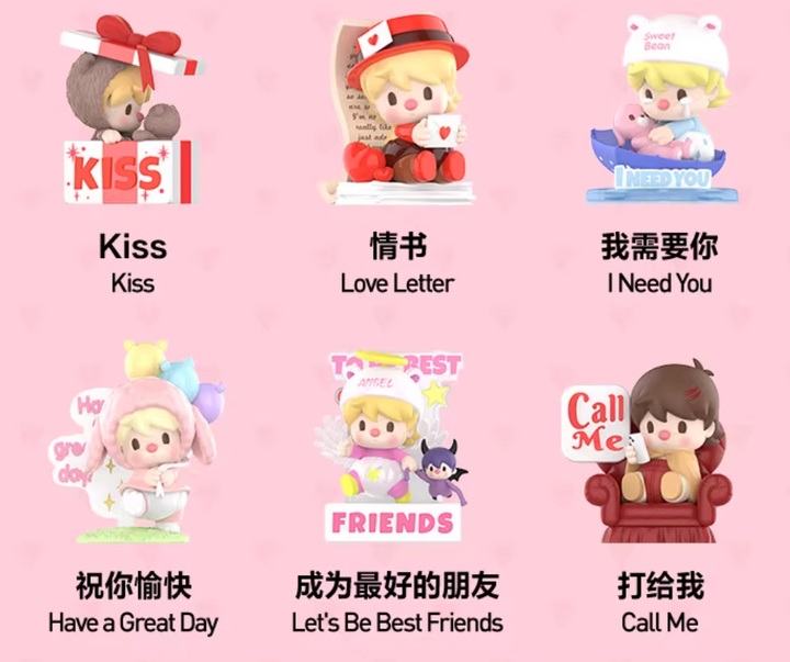 Unopened Single Blind Box, Full Case, kiss, love letter, I need you, Have a great day, Let's be best friends, Call Me, Morning, Good Night, For You, You are the Best, Can't Wait to See You, I believe in you, Forever Love |