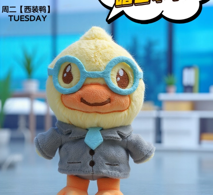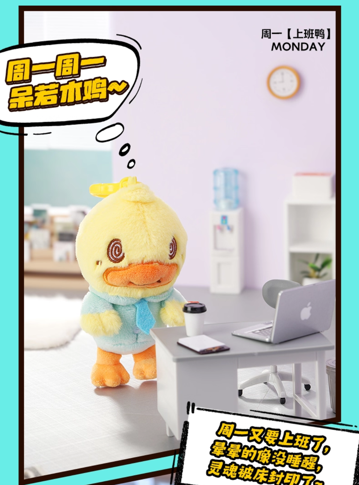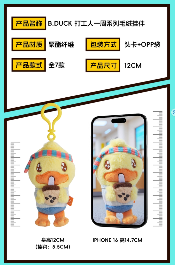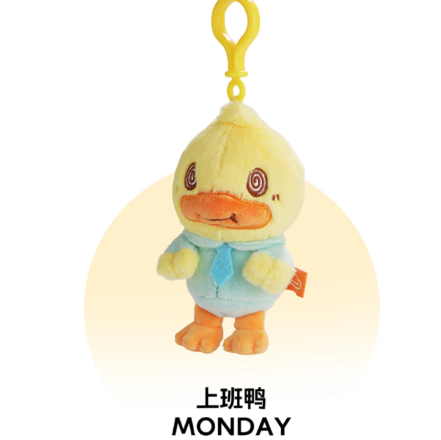 The B.Duck Official Worker’s One Week Series Plush Keychain features a different mood for each day of the week, perfectly capturing the emotional journey of a worker from Monday's exhaustion to Sunday's relaxation. Each keychain is made from high-quality plush material, offering a soft touch and detailed craftsmanship. The unique design of each keychain reflects the various emotions and states that come with the workweek, adding a playful and personalized touch to your daily life. Whether hanging on your bag, keys, or as a fun decoration, this series brings a different mood each day, helping you find little moments of joy amidst a busy life.