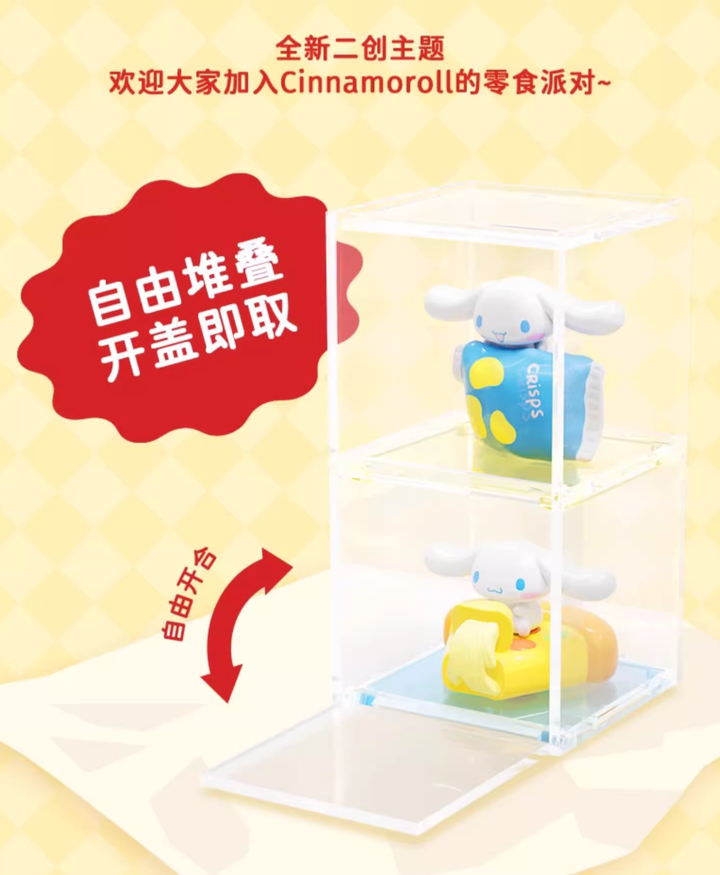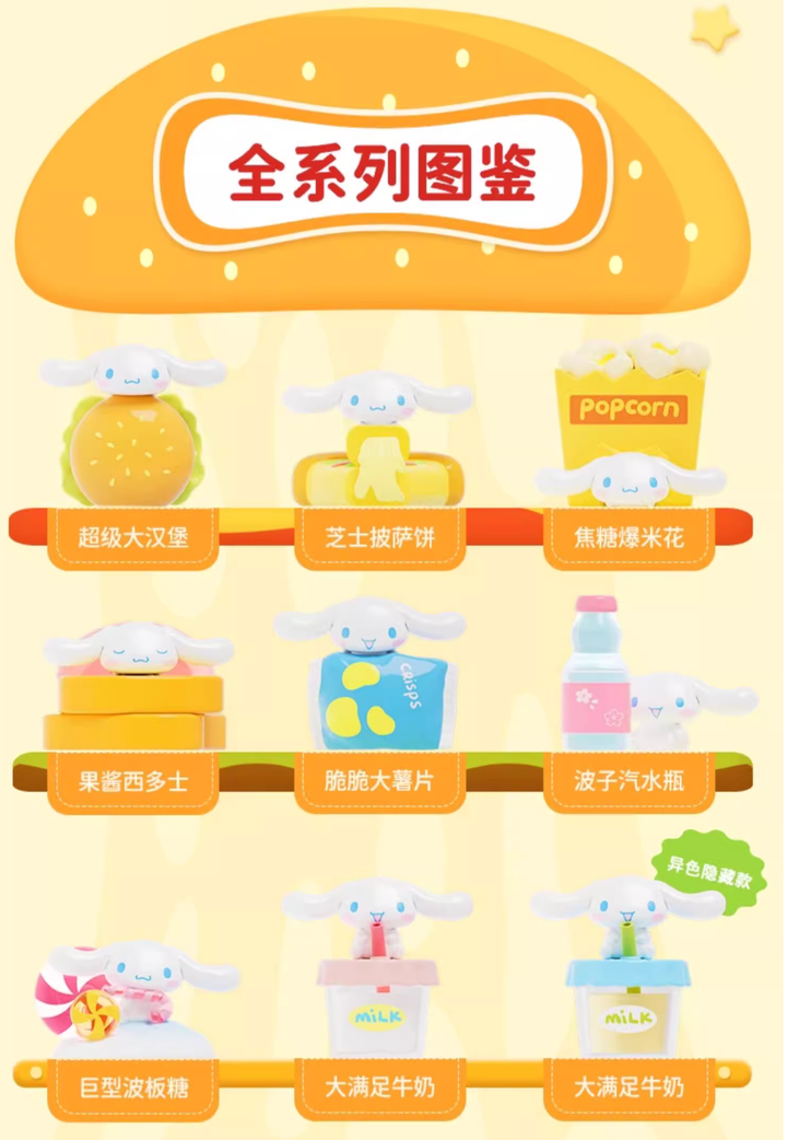 The Cinnamoroll Convenience Fast Food blind box combines the beloved Cinnamoroll character with fun, quirky convenience food elements. Each figure features a small character paired with a large prop, creating a humorous contrast and adding to the charm of the collection. With 8 figures in each box and the excitement of hidden variants, every unboxing is a delightful surprise.