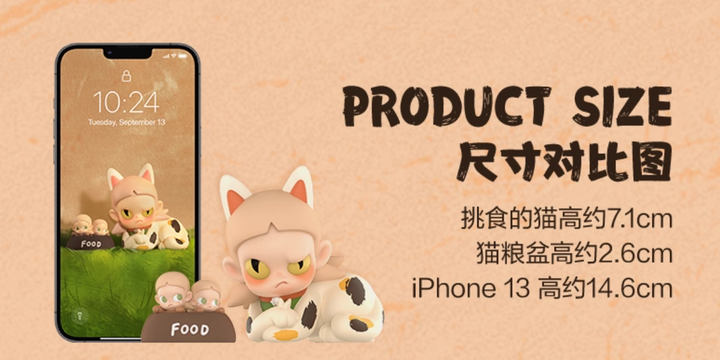 The figure comes with a cute cat food bowl accessory, perfectly recreating the playful scene of a picky eater. From the cat's fur texture to the character's detailed expression, every element reflects the designer’s dedication to fine craftsmanship. The lively and engaging design brings a touch of personality and warmth, making it a must-have for cat lovers and figure collectors alike.