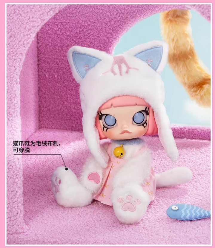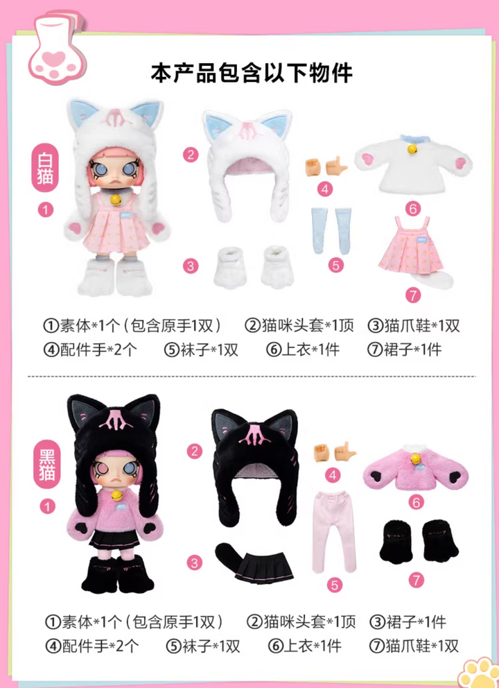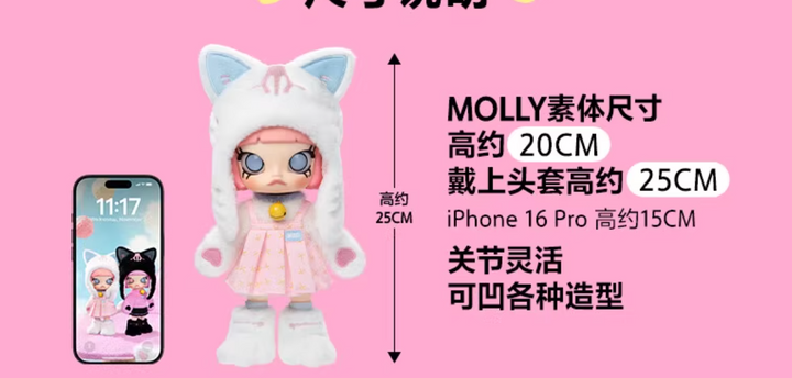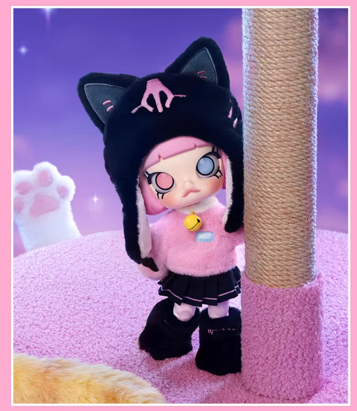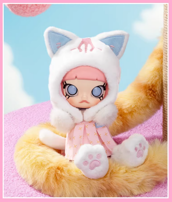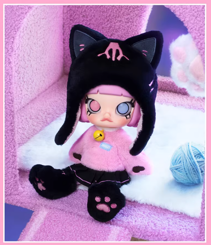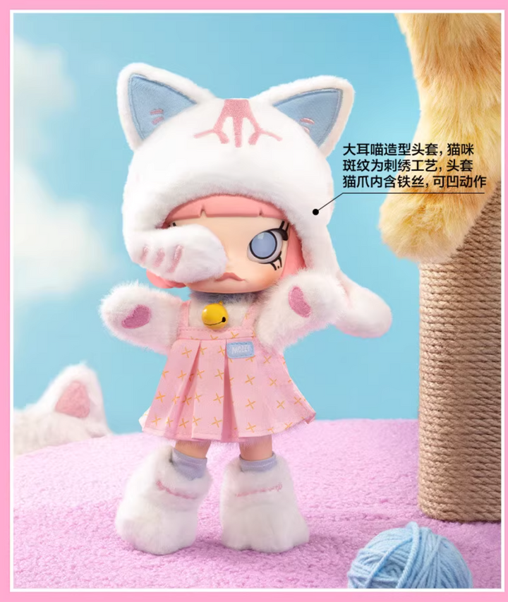 MOLLY plays hide-and-seek in her cutest form yet! This 25cm tall articulated figure features charming cat-inspired outfits and a bendable cat hood with inner wire, allowing for dynamic posing and creative display.