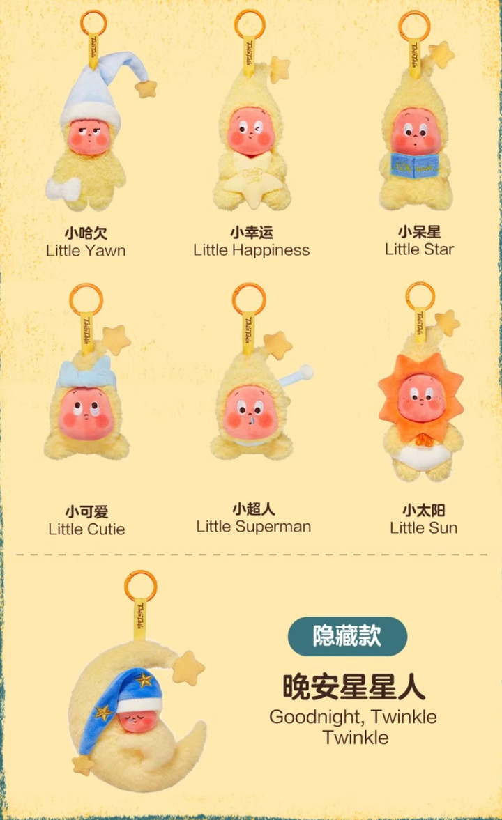 The beloved Twinkle Twinkle characters are now softer than ever! This blind box series combines designs from We Are Twinkle Twinkle and Be A Little Star, reimagined as plush keychains. Cute, dreamy, and collectible — each blind box holds a surprise starry friend that you can clip onto your bag, keys, or display as part of your collection.
