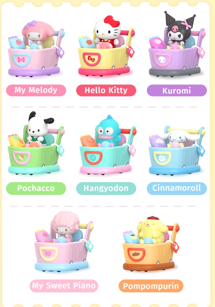 Step into the sweet world of Sanrio’s snack cars! The Sanrio Snack Car Toy Blind Box is a wind-up toy that can automatically detect edges and move on any surface. Each snack car features Sanrio’s classic characters and designs, creating a cute and playful toy with a unique snack truck appearance. The wind-up mechanism allows the car to move forward and turn, providing endless fun and interaction! Each box contains multiple blind bags, offering a brand-new collecting and playing experience.
